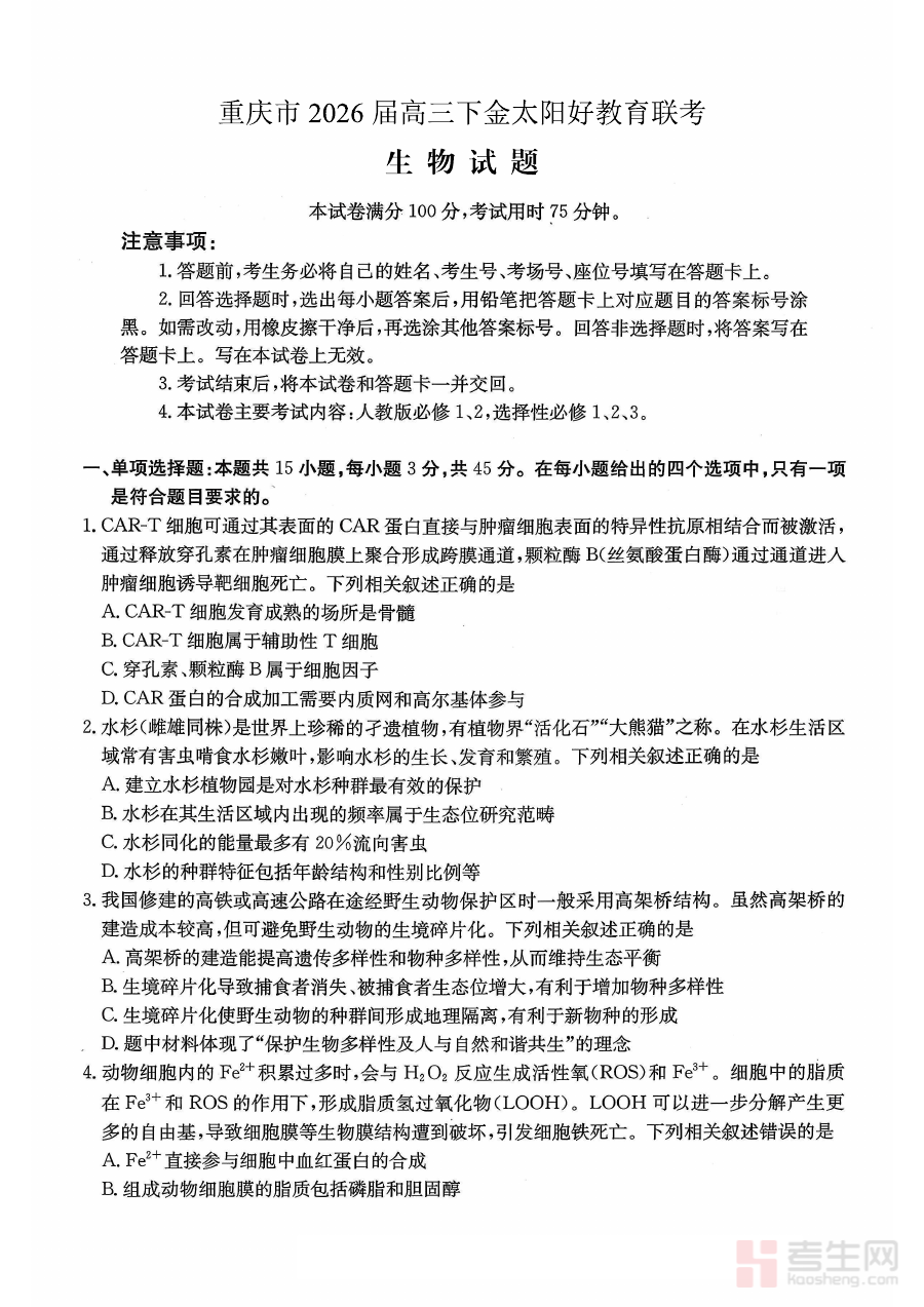 《重庆好教育联盟2026届高三下学期3月开学联考(26-284C)生物》是由重庆好教育联盟组织旗下成员校联合命题的2026届高三下学期3月开学阶段生物学科联考资料,面向重庆市范围内该联盟的高三学生群体,旨在通过标准化的联考形式检测高三学生在开学初期的生物知识掌握程度与学习状态,是高三年级高考备考进程中重要的阶段性检测类备考资源