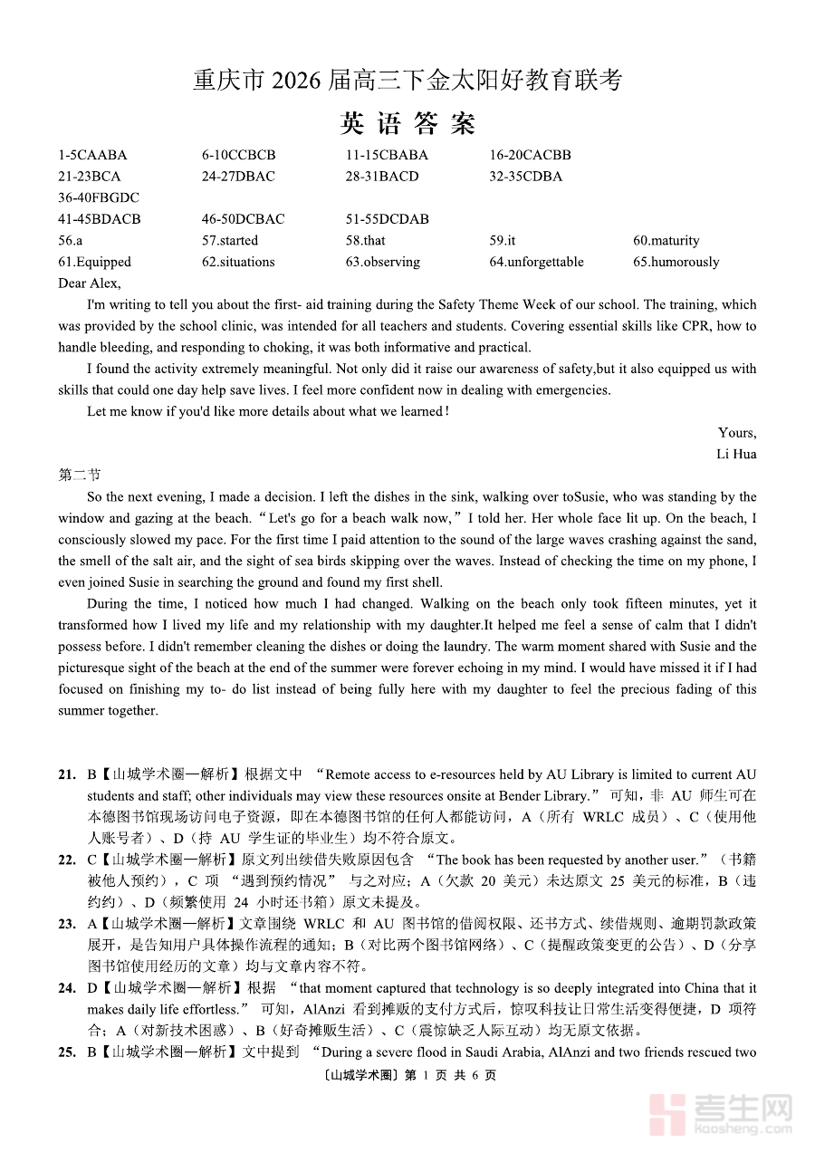 该资料适用于2026届重庆好教育联盟成员校的高三学生及英语教师。对于学生而言,它是开学后自我诊断、调整学习计划的重要工具;对于教师来说,它是开展针对性教学、制定阶段性备考方案的关键参考。通过使用这份答案资料,师生能够更清晰地把握开学阶段的学习状况,为接下来的高考复习奠定坚实基础,提升备考效率与质量。