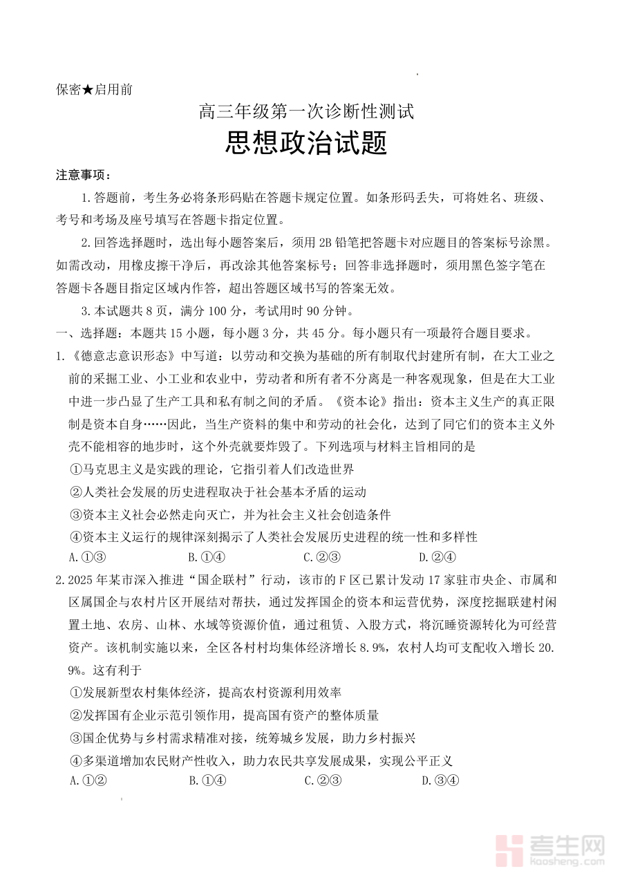 该资料适用于山东省东营市2026届高三年级的政治学科学生、一线教师及区域教育教研人员。对于学生而言,它是了解自身学习短板、明确备考重点的重要参考;对于教师而言,可依托测试结果优化教学策略,提升课堂教学的适配性;对于教研人员而言,它能为区域内高三政治学科的教学质量监测和备考策略研究提供数据支持,具有显著的阶段检测与备考指导价值。