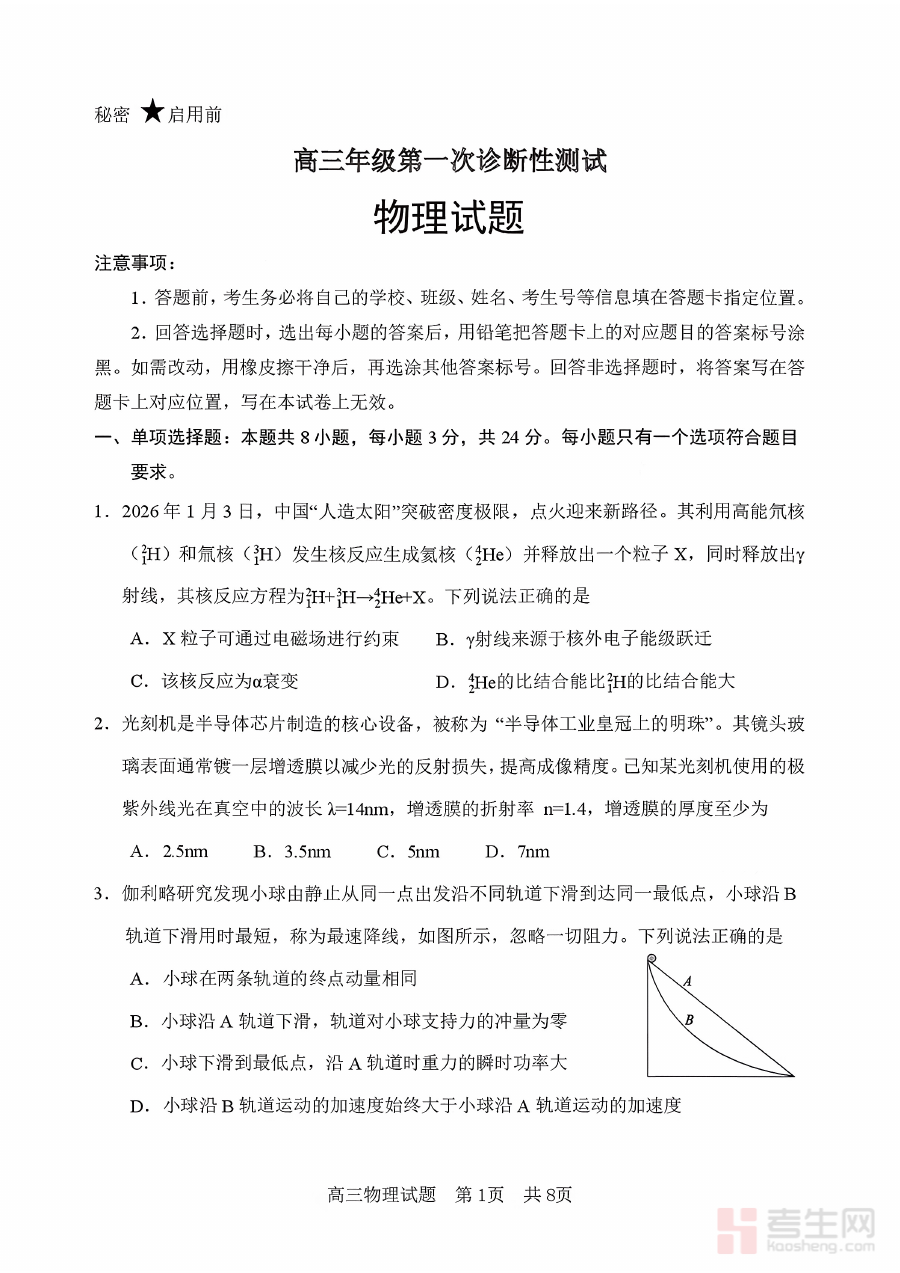 该资料的核心用途在于通过诊断性测试形式助力学情诊断,帮助教师与学生精准把握当前物理学科学习状况,发现学习中的薄弱环节与知识漏洞,为针对性复习与教学调整提供数据支撑;参考答案的配备则让学生在完成测试后及时核对结果、理解解题思路与方法,进一步巩固知识、提升解题能力,辅助科学备考规划的制定。
