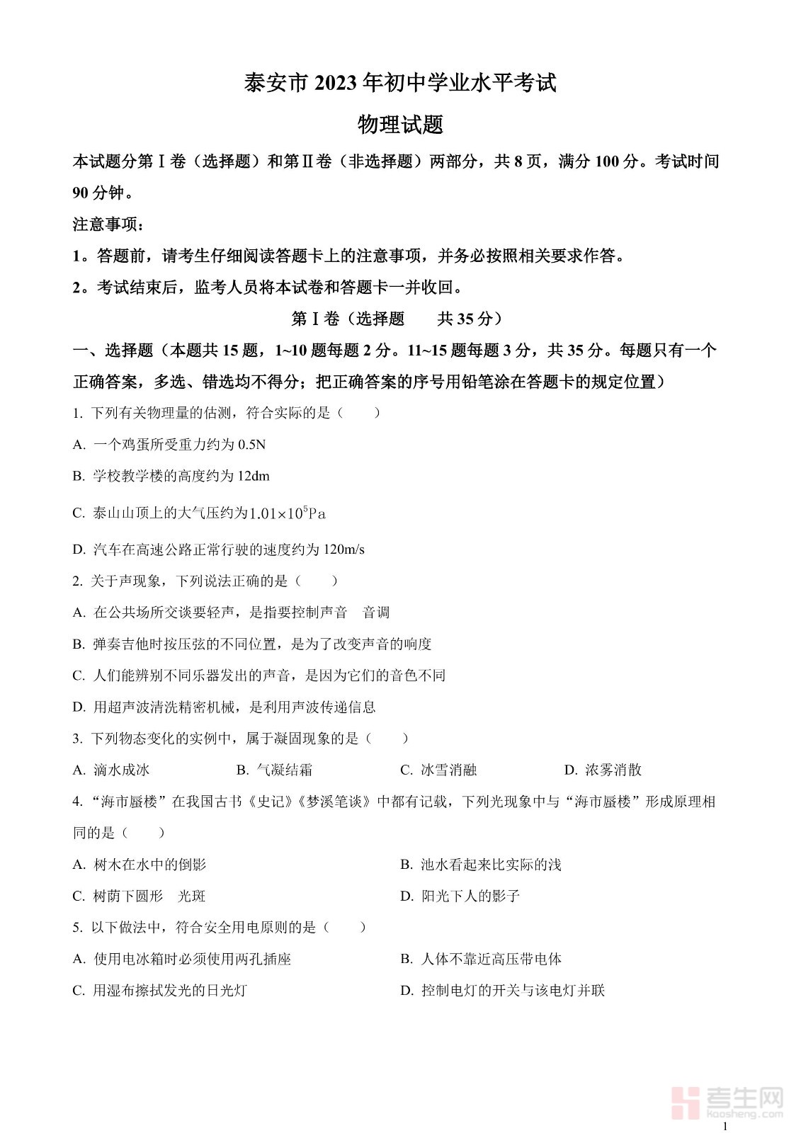 2023年山东省泰安市中考物理试题(原卷版)