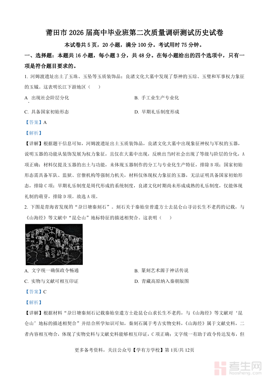 《历史答案-福建省莆田市2026届高中毕业班第二次质量调研测试试卷(莆田二检)》是针对福建省莆田市2026届高中毕业生开展的第二次质量调研测试历史科目的配套答案资料,该考试属于区域内高中阶段重要的学业质量检测,旨在客观反映学生历史学科的阶段性学习成果与核心素养发展水平。