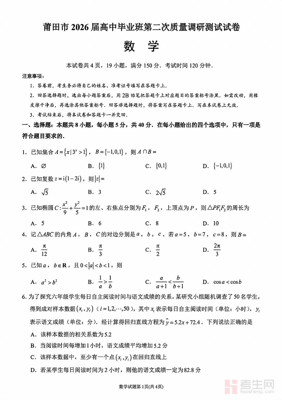 该资料主要用于2026届莆田市高中毕业生高考备考过程中的阶段性学情诊断与评估,帮助考生及时掌握自身数学学科知识掌握程度及能力薄弱环节,同时为学校和教师提供科学的教学反馈数据,辅助调整后续教学策略与备考计划,确保备考方向与本地考试要求高度契合。