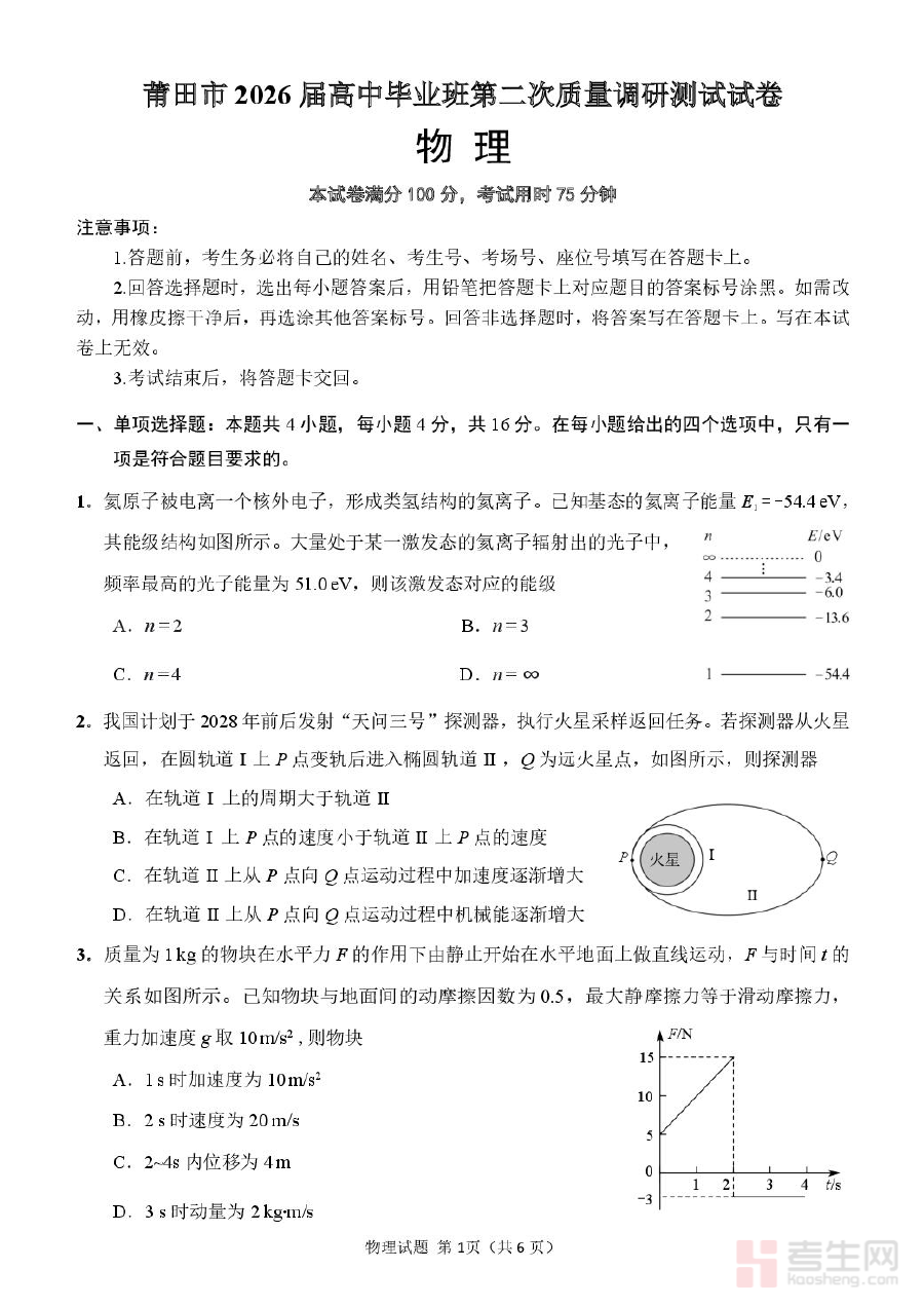 《物理试卷-福建省莆田市2026届高中毕业班第二次质量调研测试试卷(莆田二检)》是福建省莆田市教育系统针对2026届高中毕业班学生组织的第二次质量调研测试的物理学科专用试卷,属于当地高三阶段重要的阶段性评估资料,旨在通过规范的测试流程和科学的命题设计,全面反映学生在物理学科上的知识掌握程度与应用能力水平,为后续的复习备考提供关键参考依据。