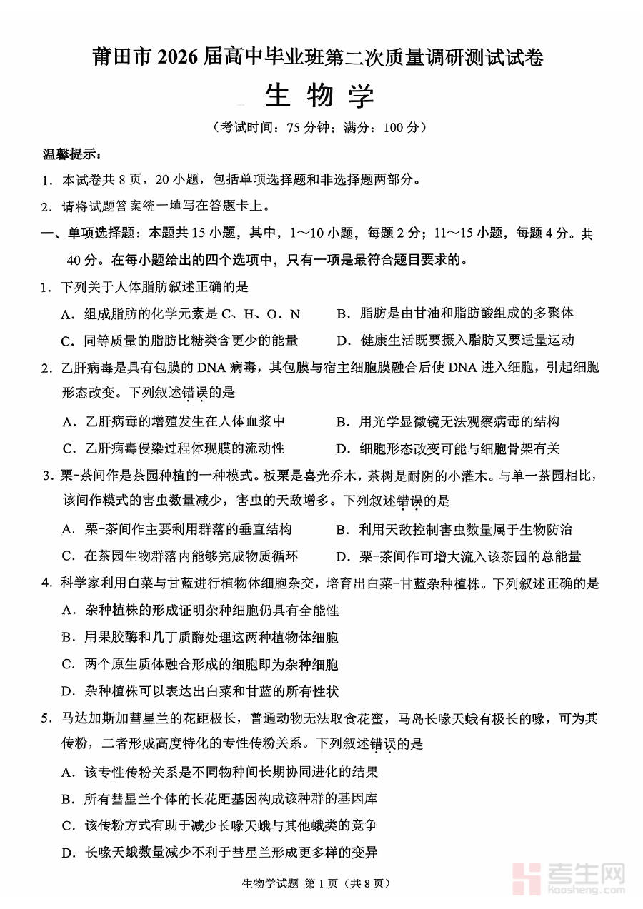 本试卷主要适用于福建省莆田市2026届高中毕业班的生物学科学生及相关教师群体。对于学生而言,它是自我评估阶段学习效果、明确备考方向的重要工具;对于教师而言,它能辅助优化教学方案、精准把握班级学情动态。其核心价值在于通过规范的阶段检测,帮助师生及时调整备考节奏,提升备考效率,为最终高考生物学科的优异表现奠定坚实基础。