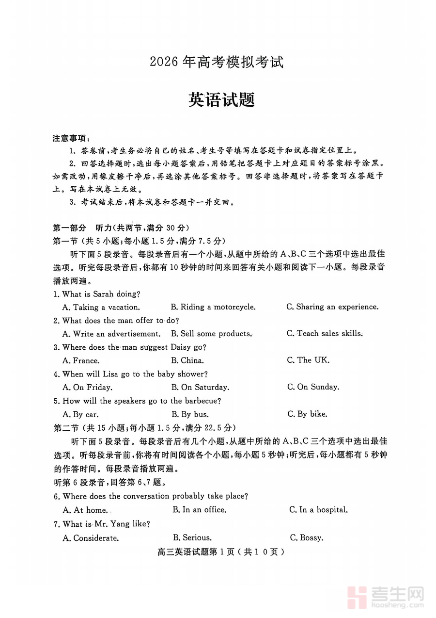 本资料适用于济宁市2026届全体高三学生,尤其是需要进行阶段性自我检测、优化备考规划的学生群体。它不仅是一次模拟考试的实践载体,更是学生梳理知识体系、调整备考节奏的重要工具。通过使用该资料开展模拟练习或正式检测活动,学生能够有效提升应试能力、增强考试信心,为后续的二模、三模及最终高考积累实战经验,助力其在高考英语科目中取得理想成绩。