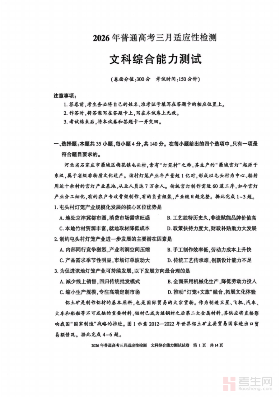 《文科综合-2026年新疆普通高考三月适应性检测试卷(含答案)》是2026年面向新疆地区普通高考文科考生推出的适应性检测资料,属于高考备考周期中关键阶段的阶段性检测工具,旨在贴合当地高考命题趋势与要求,帮助考生提前适应高考文科综合科目的考试节奏与题型特点。