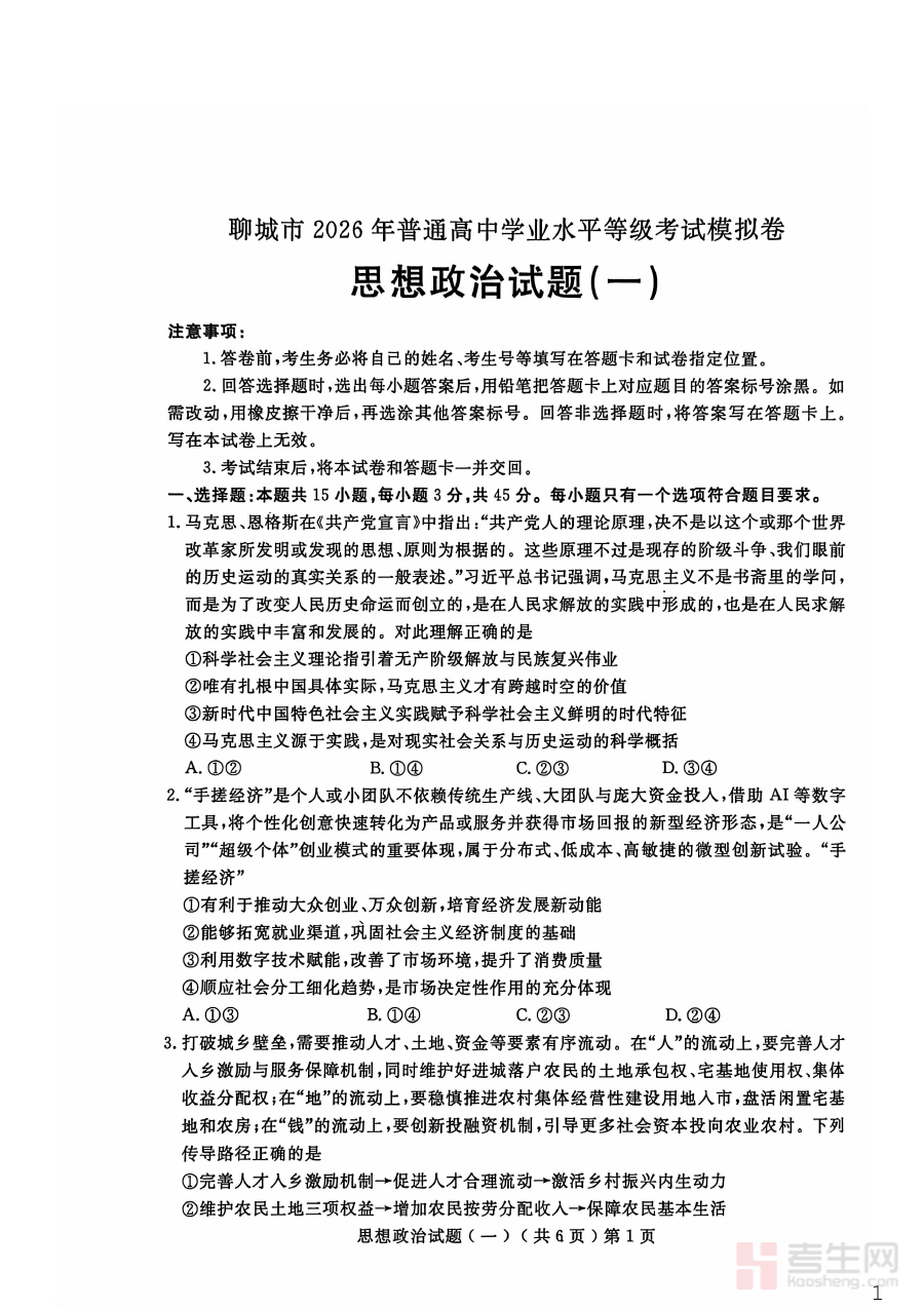 该模拟卷的核心适用人群为聊城市普通高中阶段即将参加2026年普通高中学业水平等级考试的学生及相关政治学科教师。对于学生而言,使用该卷能有效提升对考试形式的适应度,增强应试信心;对于教师而言,则可借助其开展针对性教学与评价,助力提升整体备考质量,具有显著的阶段检测与备考指导价值。