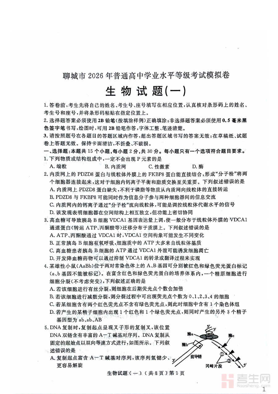 该资料的核心适用人群为聊城市2026届普通高中三年级学生,同时也适用于担任高中生物教学任务的教师群体。对于学生而言,完成该模拟卷能够帮助其在正式考试前进行系统的自我评估,发现知识漏洞并及时弥补,提升应试能力与信心;对于教师而言,该模拟卷可作为教学评估与备考指导的重要参考,辅助教师设计更符合学生需求的复习方案,共同推动备考质量的提升。
