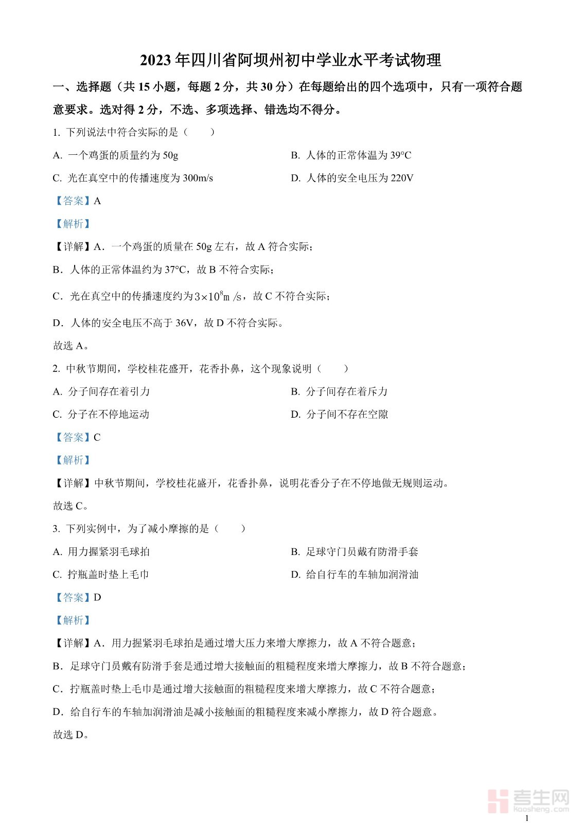 2023年四川省阿坝州中考物理真题(解析版)