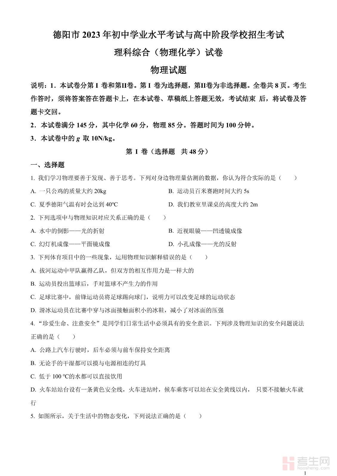 2023年四川省德阳市中考理综物理试题(原卷版)