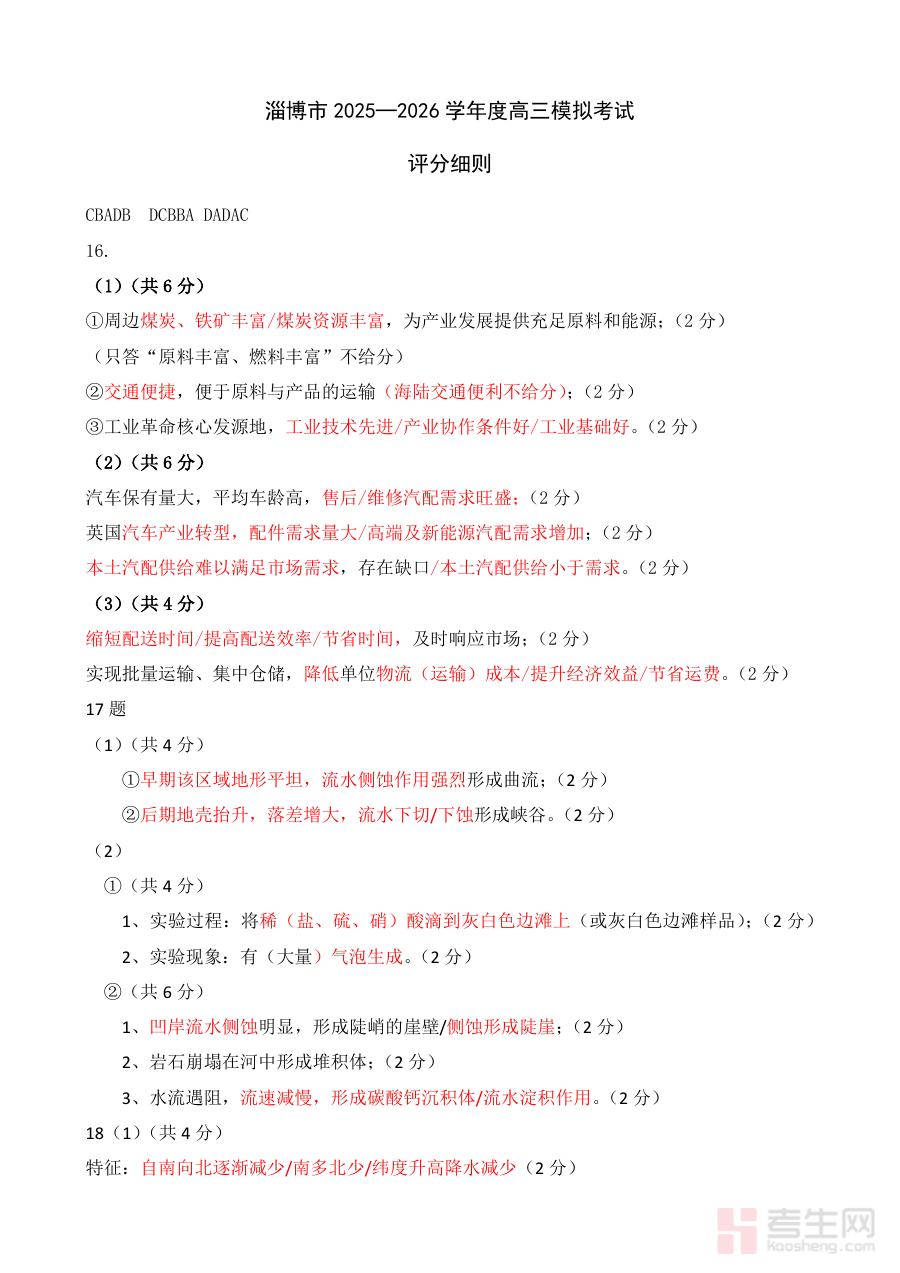 《淄博市2025-2026学年度高三模拟考试 地理答案》是针对淄博市2025至2026学年度高三年级地理学科模拟考试的配套答案资料,该考试属于区域内高三阶段的重要模拟测试,旨在贴合当地教学进度与高考备考方向,为学生提供标准化的作答参考依据。