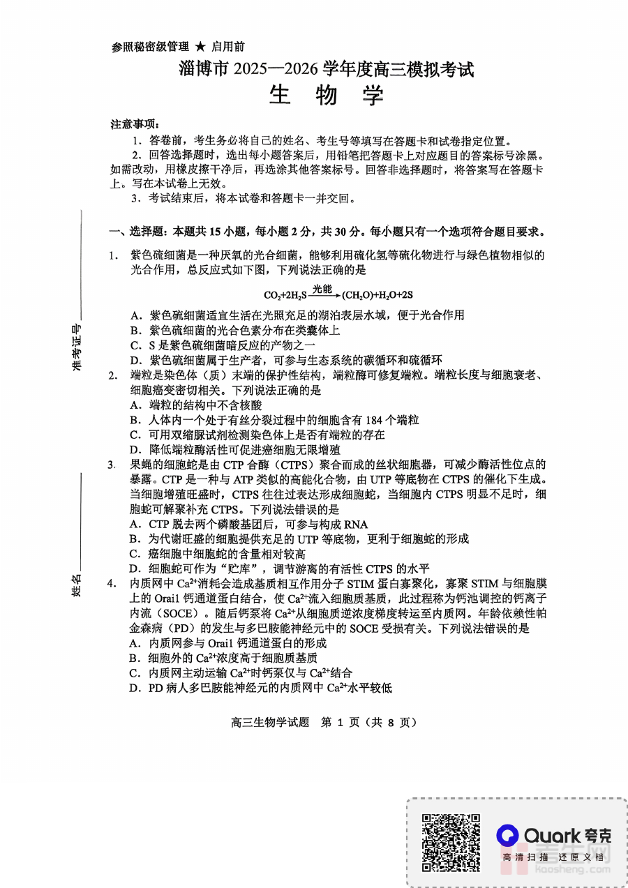 《淄博市2025-2026学年度高三模拟考试 生物》是针对淄博市该学年度高三年级生物学科的模拟考试相关备考资料,聚焦当地高三生物教学的阶段要求与考试方向,能够为学生提供贴合本地教学实际与考试标准的练习资源,助力学生提前适应本地区高三生物模拟考试的形式与要求,是该学年淄博地区高三生物学科备考过程中的重要辅助材料。
