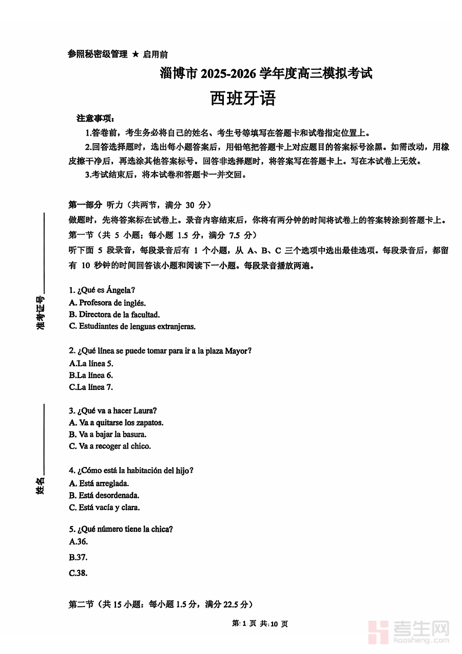 本资料主要适用于淄博市2025-2026学年度的高三西班牙语学生及任课教师。对学生而言,参与模拟考试可提升应试能力与知识运用水平;对教师而言,可通过分析考试结果优化教学方案,共同提升高三西语学科的备考效率与质量。