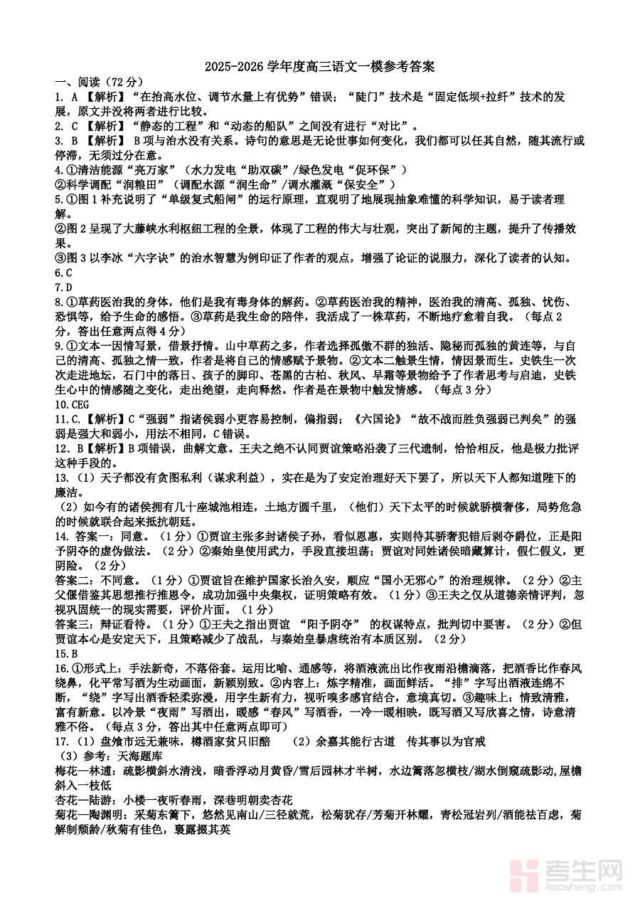 该答案资料的核心用途在于辅助完成学情诊断与备考优化。对于高三学生,在完成模拟考试后可通过核对该答案快速定位自身在语文知识掌握与答题规范上的薄弱环节;对于教师,则可借助该答案进行客观评分与教学效果评估,为调整教学计划、制定更具针对性的备考策略提供依据,助力提升整体备考质量。