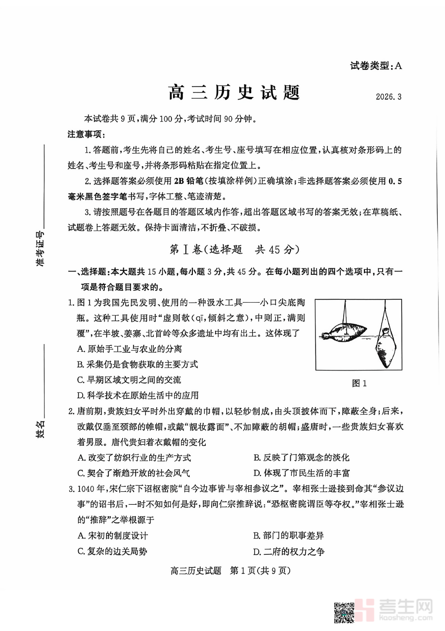 适用人群为山东省滨州市2026届高三年级学生及相关历史学科教师,作为区域内标准化阶段性模拟考试资料,其核心价值在于帮助学生熟悉本地考试命题风格与考察重点,提升应试能力与时间管理技巧;同时为教师提供符合本地教学实际的评估工具,促进教学内容与备考需求精准对接,助力师生高效完成备考阶段各项目标任务。