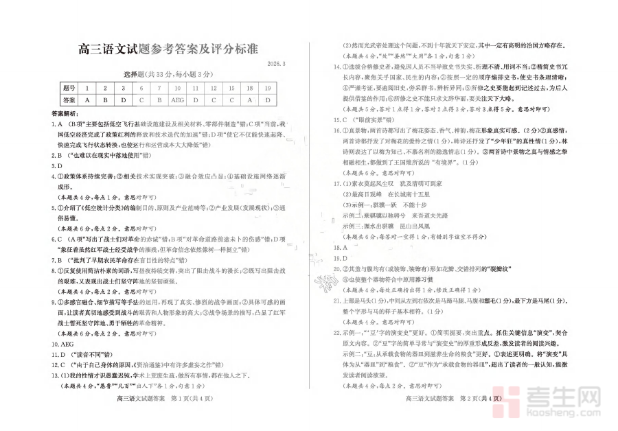 这份答案主要适用于山东省滨州市2026届高三年级的语文教师、学生以及相关教学工作者。对于学生而言,它能帮助其在一模考试后及时进行自我检测与深度反思,有效提升备考效率;对于教师来说,它是开展试卷讲评、制定个性化教学方案的核心参考;对于教学研究者而言,可通过分析答案中的评分标准与作答导向,了解区域内高三语文教学的重点方向和评价体系,具有一定的实践指导价值。
