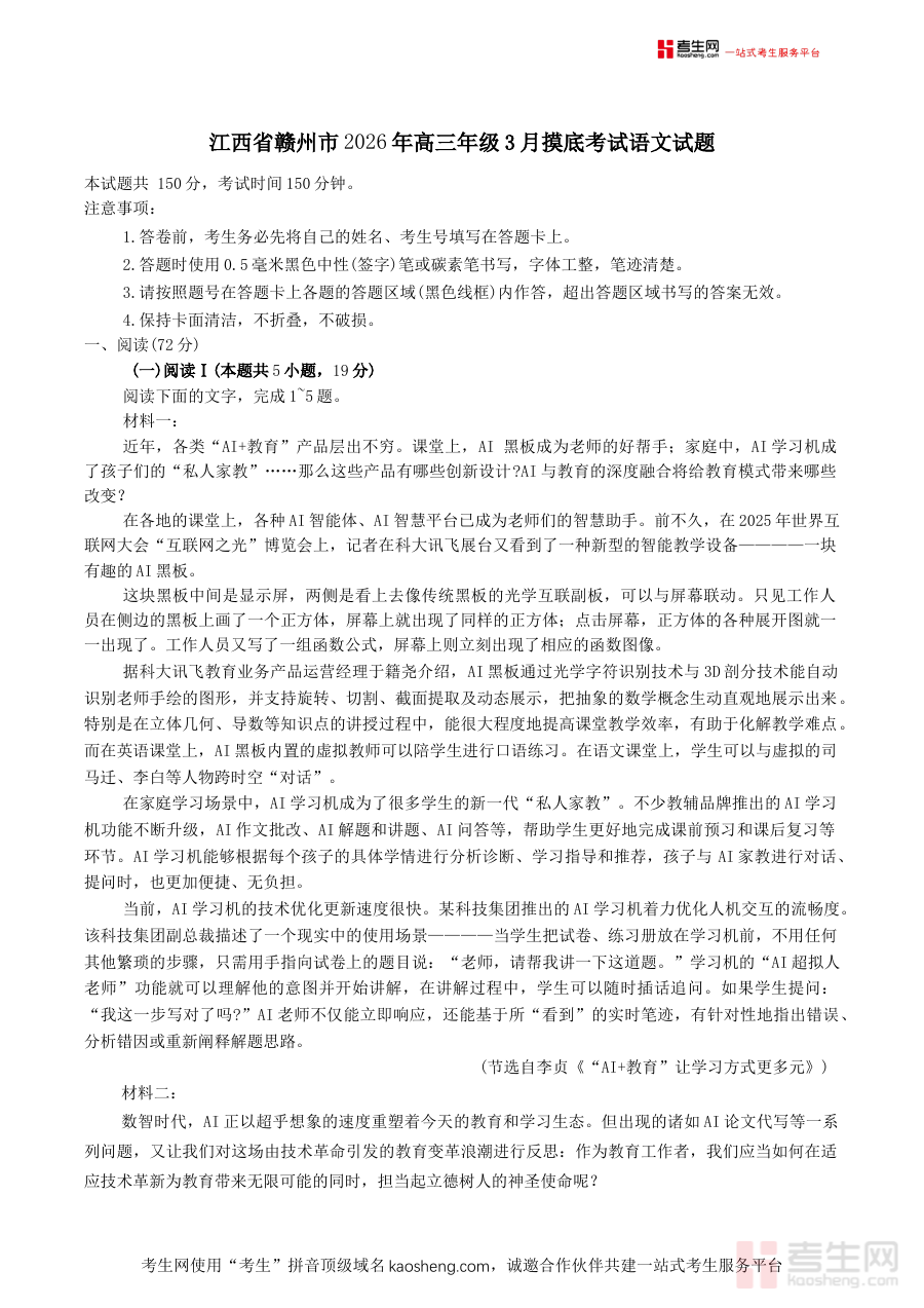 《江西省赣州市2026年高三下学期3月摸底考试语文试题(含答案)》是江西省赣州市针对2026届高三学生在第二学期3月推出的语文阶段性检测资料,包含完整试题及配套参考答案两部分内容,属于高三备考周期中关键时间节点的重要参考材料,旨在为师生提供该阶段语文学习成效的客观反馈依据,助力把握当前学习状态与整体水平。