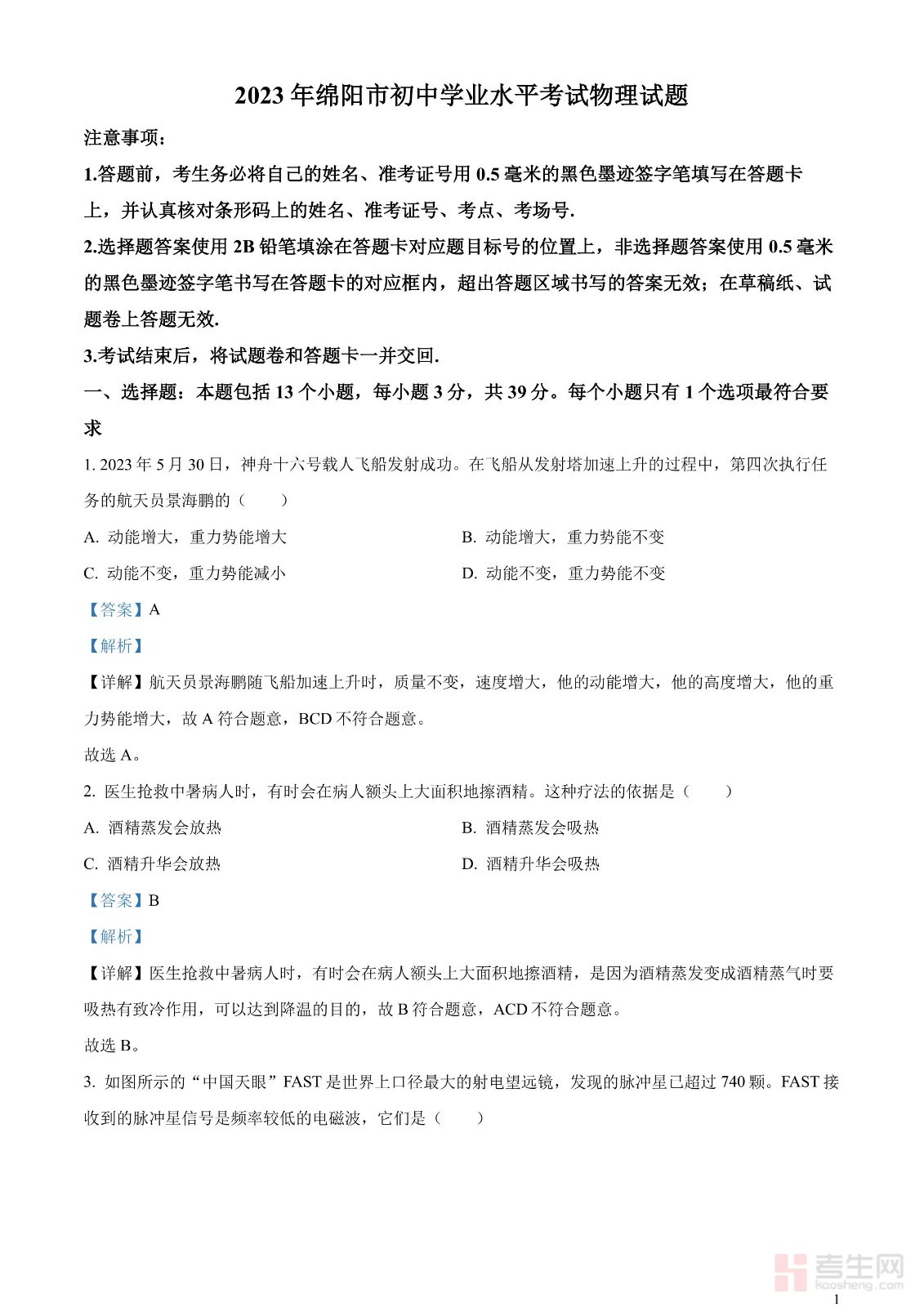 2023年四川省绵阳市中考物理试题(解析版)