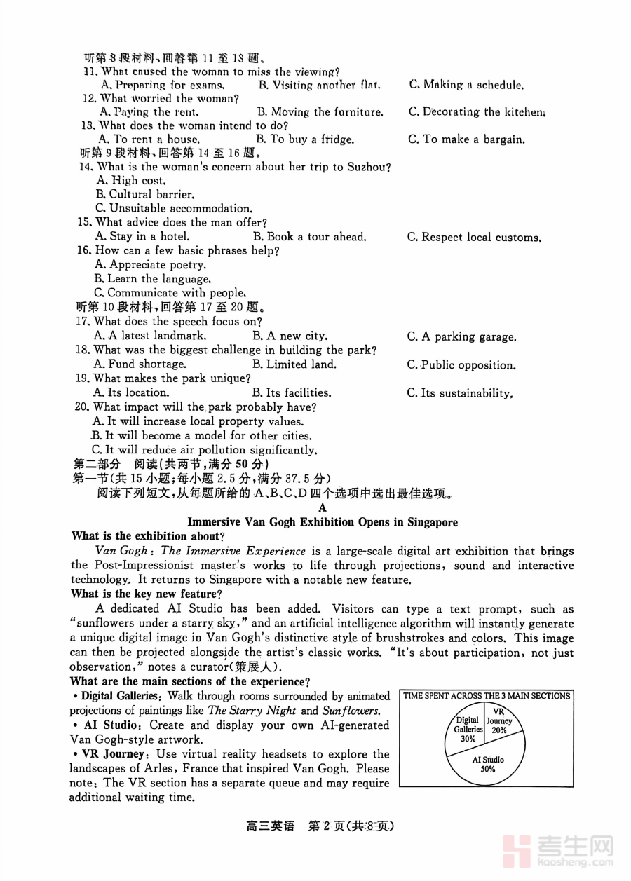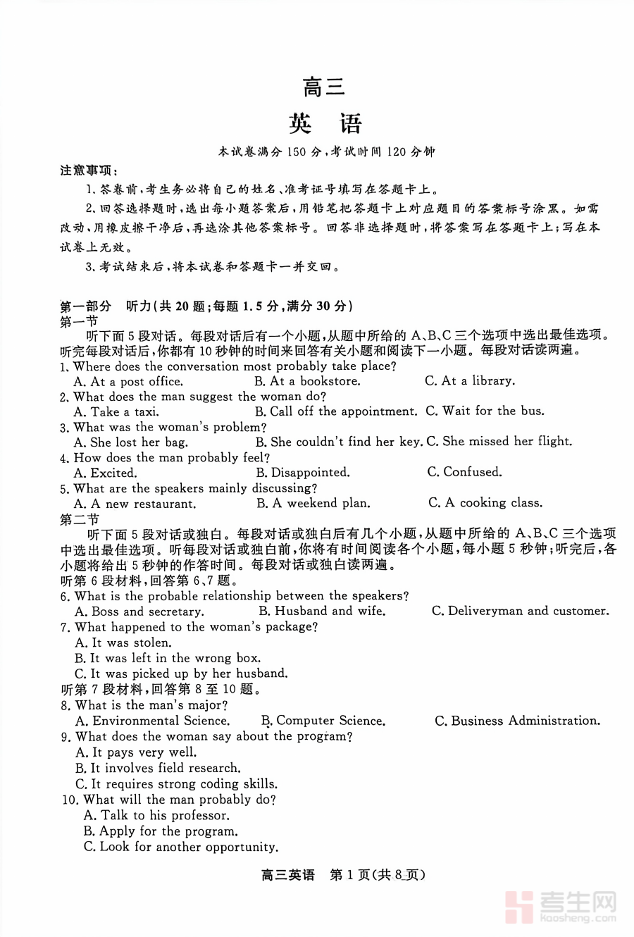 该试题卷主要用于高三学生英语学科的学情诊断、阶段检测与备考规划指导。通过使用试题卷进行练习或参与联考分析,学生可清晰识别自身在英语知识掌握与应试能力上的优势及薄弱环节;教师则能依据试题反馈的整体数据调整教学策略,优化复习计划的针对性,为后续的二轮或三轮复习提供明确的改进方向。同时,它也有助于引导学生适应联考的考试节奏与命题风格,积累应试经验。