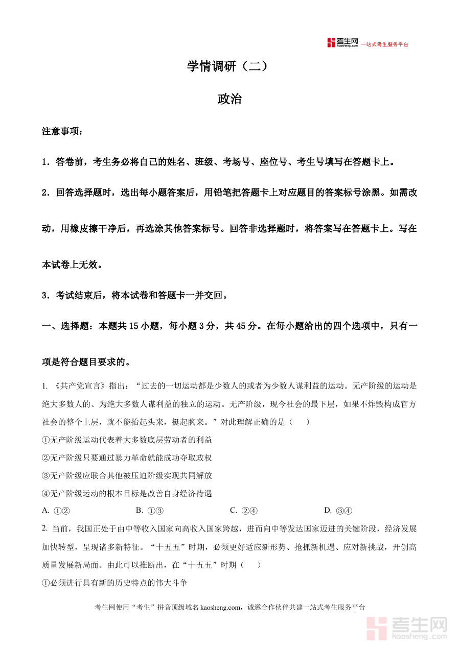 该资料适用于2026届高三政治教师及学生群体,通过参与本次调研检测,学生可及时发现学习漏洞并开展针对性补强,教师则能基于调研结果制定更具靶向性的教学方案,共同提升高三下学期政治学科的备考效率与质量。
