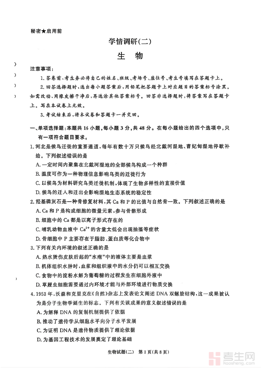 该资料主要用于高三学生生物学科的学情诊断与阶段检测,通过标准化的调研形式,帮助师生及时识别知识掌握中的薄弱环节与能力短板,为后续的复习规划调整提供科学依据,助力学生在备考过程中精准定位提升方向,优化复习策略,提升备考效率。