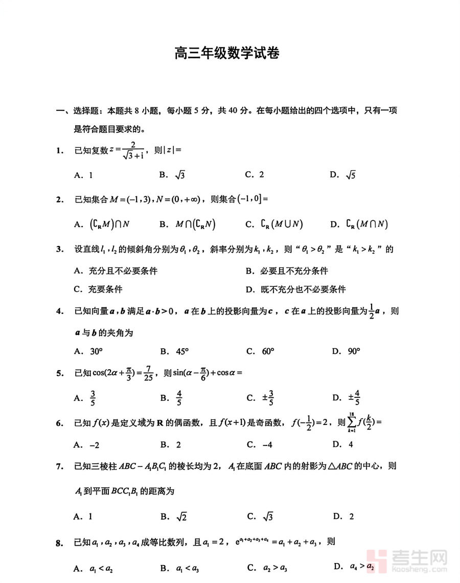 该资料主要用于高三学生的阶段性学业水平诊断与备考规划调整,能够帮助学生及时发现自身数学知识掌握的薄弱环节,辅助教师开展精准化教学反馈,为后续复习策略的优化提供数据支撑;其附带的答案部分可支持学生自主核对学习成果,提升自我评估能力,同时为教师的评讲与指导提供清晰依据,有效增强备考过程的科学性与高效性。