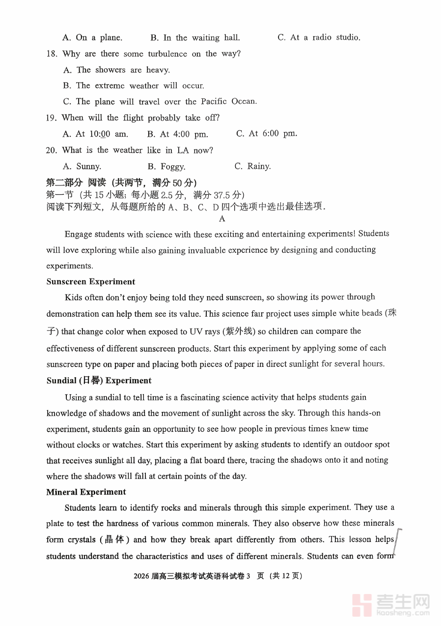该资料可用于高三学生开展英语学科的阶段性学习成果诊断,帮助师生精准把握当前学习状态下的知识掌握程度与能力短板,为后续的备考规划与教学安排提供数据支持,促进学习策略与教学方法的科学调整。