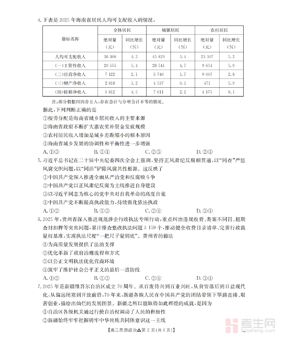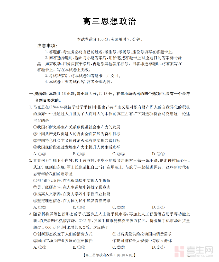 该资料可有效用于高三学生的学情诊断与阶段检测,帮助师生清晰识别政治学科学习中的薄弱模块与优势领域,为后续复习计划的优化调整提供客观依据;同时作为联考类资料,它能够模拟真实考试场景,让学生在备考过程中提前熟悉考试流程与时间管理要求,进一步提升应试能力与心理素质。