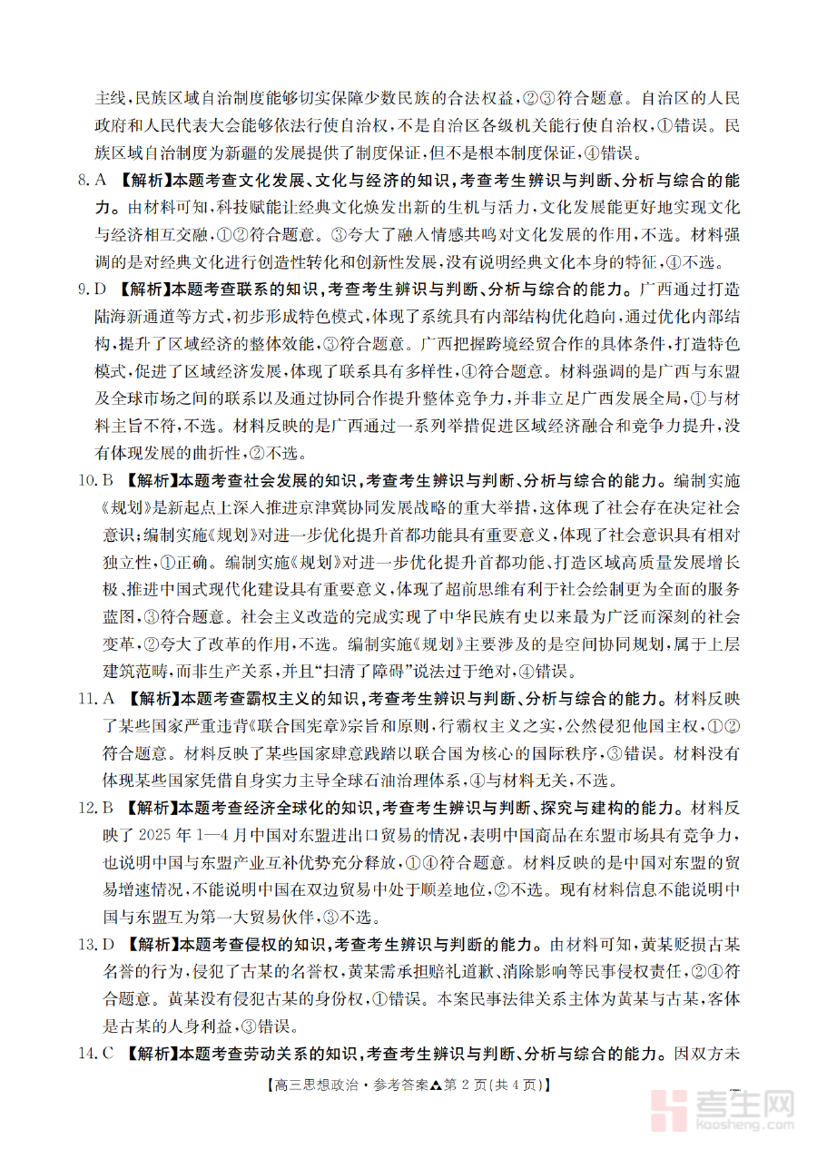 该资料可用于帮助考生及授课教师对本次联考政治学科的答题情况进行全面精准的分析与复盘,助力考生清晰识别自身在知识掌握、答题思路及技巧等方面存在的薄弱环节,为后续备考策略的调整与优化提供科学有效的依据,同时也能辅助教师开展更具针对性的教学指导与学情评估工作。