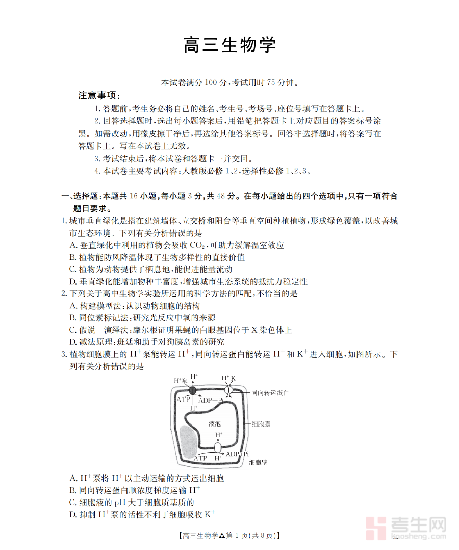 该资料可用于生物学科的阶段学情诊断,帮助教师和学生及时掌握当前学习状况,明确知识掌握的薄弱环节,为后续备考规划提供数据支撑与方向指引;同时也能作为阶段性检测工具,检验学生对前期复习内容的综合运用能力,助力师生动态调整复习策略以适应联考要求。