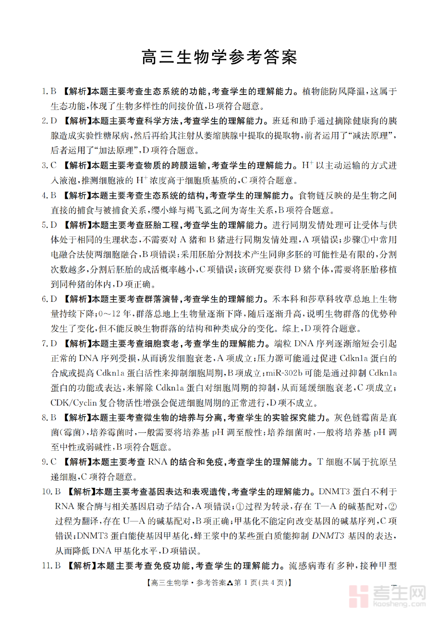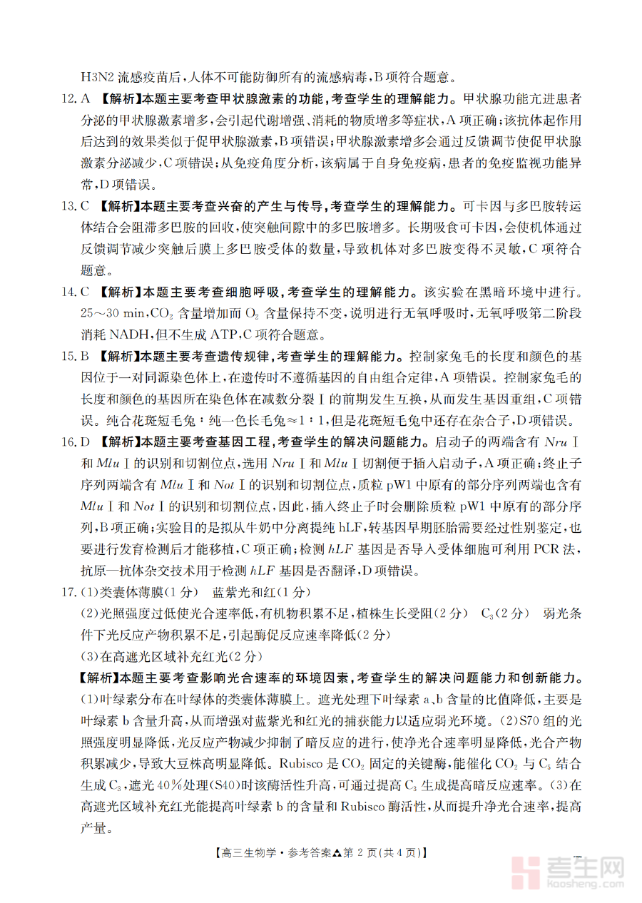 本资料适用于陕西省2026届高三学生及生物学科教师群体,学生可通过核对答案明确自身答题的正误情况,教师可依托该资料开展试卷分析与学情评估工作,对提升阶段复习效率、优化备考策略具有重要的实践参考价值。
