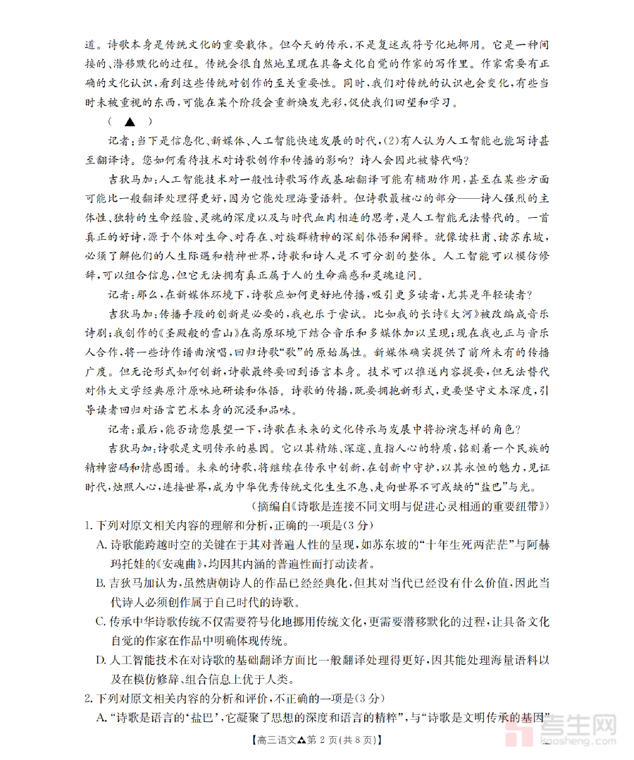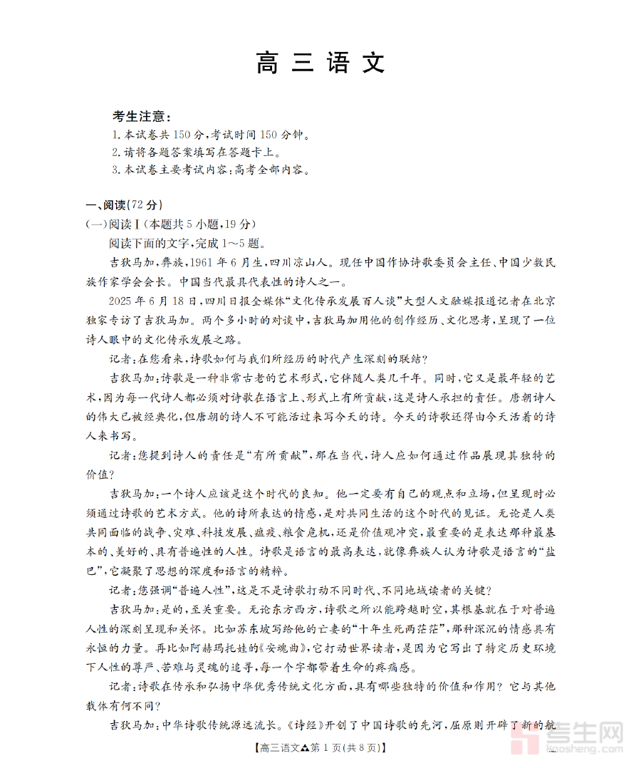 该资料主要用于高三学生进行语文学习的阶段性成果检测与学情诊断,帮助学生和教师精准把握当前学习中的优势领域与待提升环节,为后续备考策略的调整和优化提供数据支撑,同时也能让学生提前适应联考的考试形式与命题特点,增强应试过程中的节奏感和适应性。