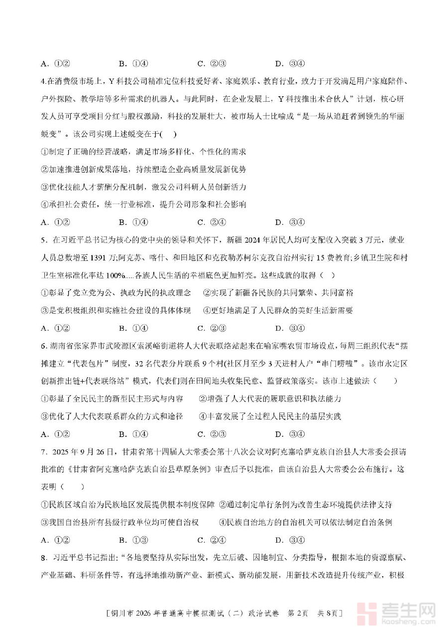 本资料适用于2026届陕西省铜川市的高三学生、政治学科教师以及相关教育教研人员。对于学生而言,它能帮助熟悉考试流程与题型特点,提升应试能力;对于教师而言,可借助试题及答案分析学生的学习状态,调整教学重点。其作为高三第二次模拟考试的配套资料,对提升区域高三政治学科备考质量具有重要的参考价值和实践意义。