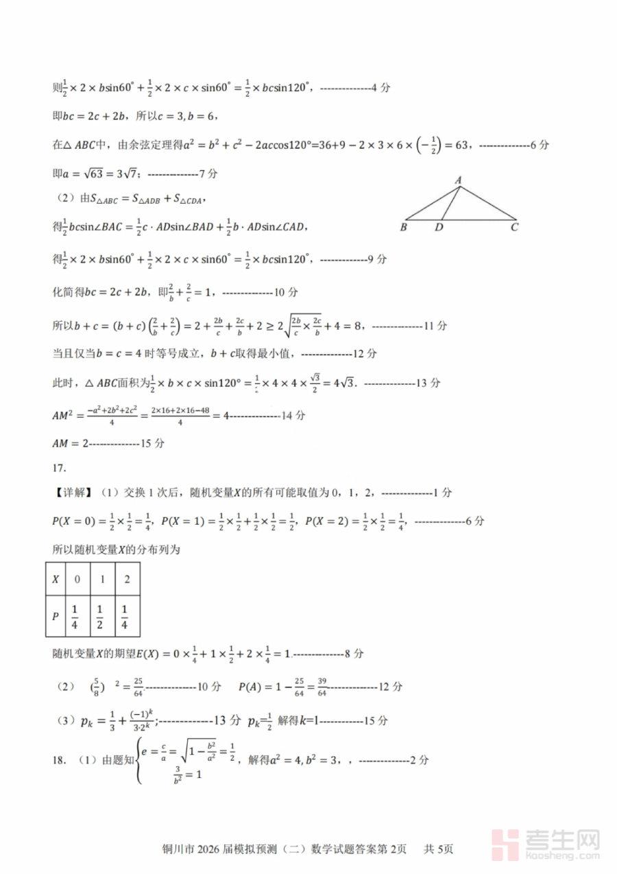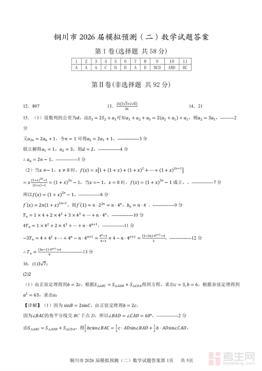 《数学答案-铜川市2026届高三模拟预测(二)》是针对陕西省铜川市2026届高三学生的数学模拟预测类考试配套答案资料,属于高三阶段重要的阶段性模拟训练辅助材料,旨在为该地区高三学生提供对应模拟考试的精准参考答案支持,助力其了解模拟考试的答题标准与方向。