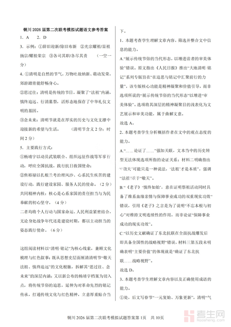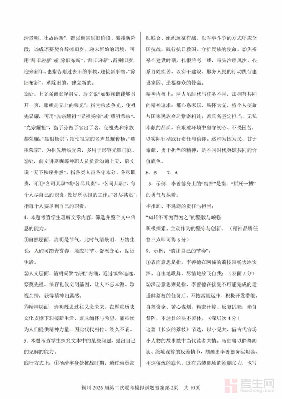 该资料适用于铜川市2026届高三年级的语文教师、学生及相关教育工作者。对于学生而言,通过对照答案进行阶段检测能够有效提升自我反思能力,助力备考规划的精准实施,在高考前的关键阶段实现学习效率的提升与备考质量的优化;对于教师来说,借助该答案资料可更高效地完成试卷批改与学情分析,为后续教学提供数据支撑;对于教育工作者而言,该资料也可作为区域内语文备考资源的重要组成部分,辅助整体备考策略的制定与推进,具有较强的实践指导价值。