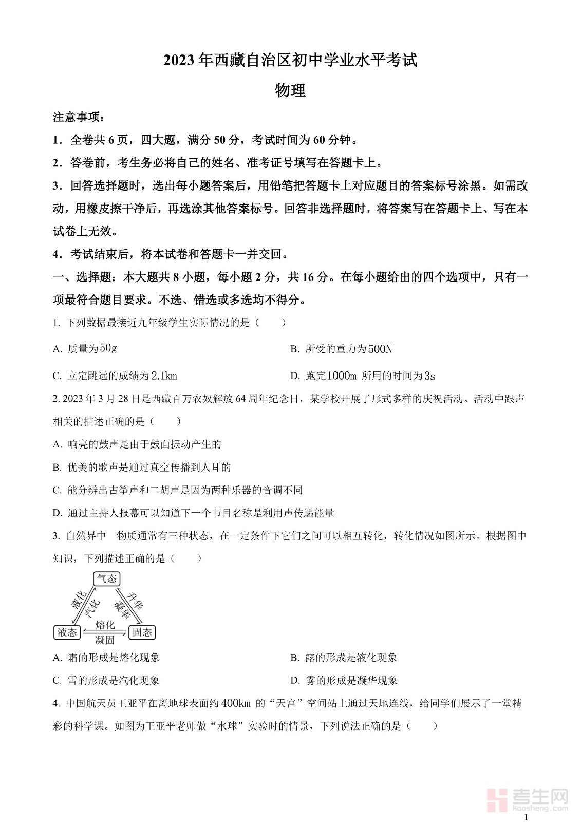 2023年西藏自治区中考物理试题(原卷版)