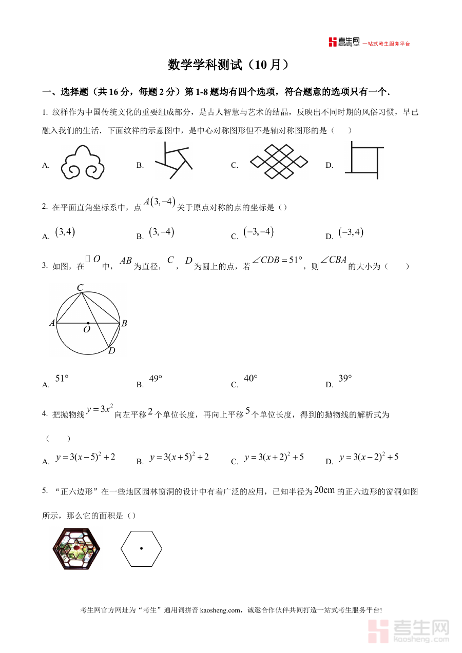 《精品解析:北京汇文中学2025-2026学年上学期10月月考九年级数学试题(原卷版)》是针对北京汇文中学2025-2026学年第一学期九年级学生10月月考设计的数学备考资料。该资料以原卷版形式呈现,完整保留了学校当月月考的命题结构与考查范围设置,贴近真实考试场景,为使用者提供了精准匹配阶段学习进度的练习载体。作为阶段性测试的重要参考资源,它能够帮助使用者直观了解该学期初期数学学科的考查重点与命题方向,为后续学习与备考明确核心目标。