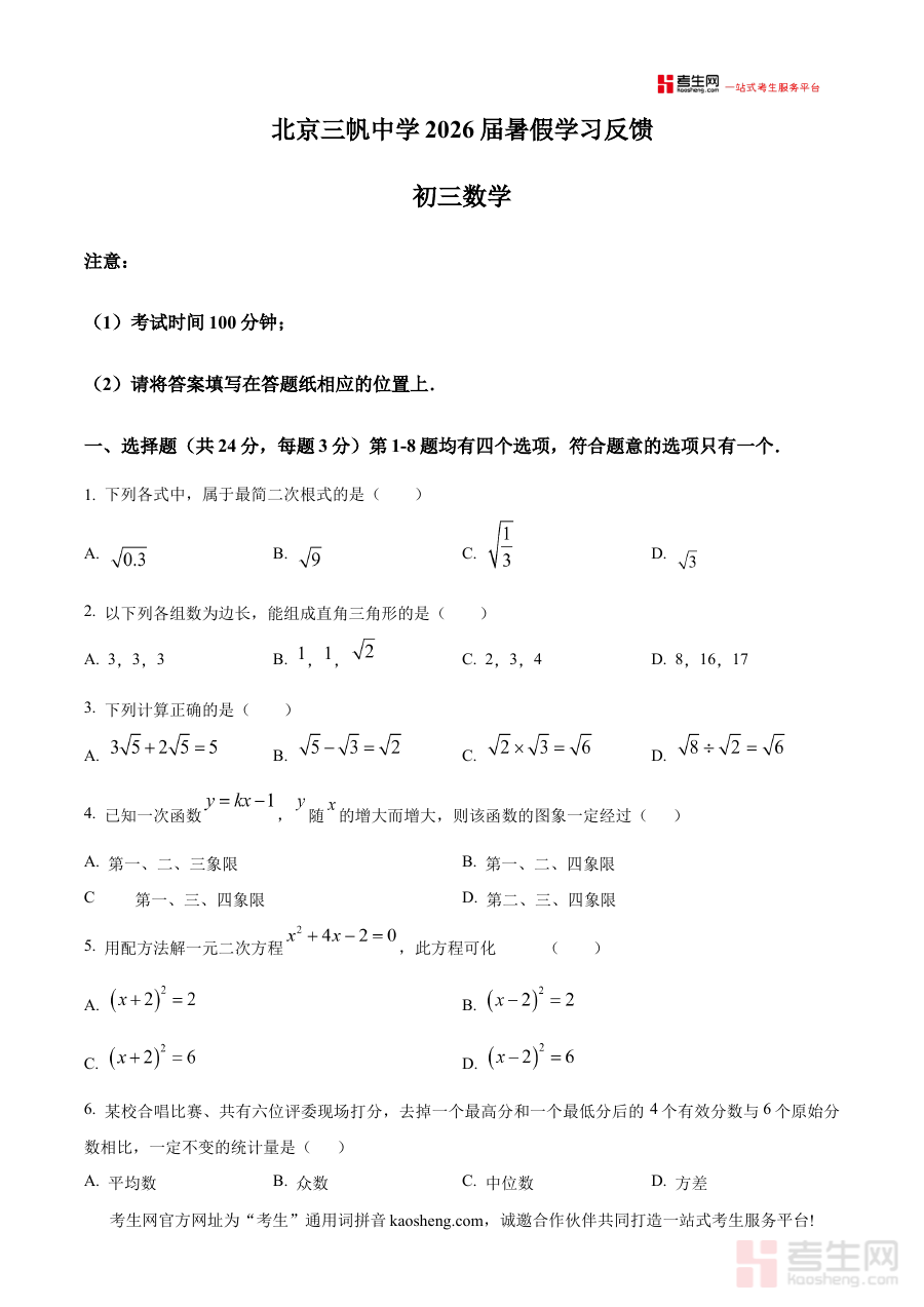 此资料主要适用于北京市三帆中学及同区域同类学校的九年级学生,尤其适合需要提前适应开学考节奏、明确新学期数学学习重点的学生使用;其原卷版特性能够让使用者真实感受考试的题型结构与考察逻辑,助力学生做好新学期数学学习的规划与准备,增强阶段检测的有效性和备考的针对性,为后续数学学习与中考备考奠定良好基础。