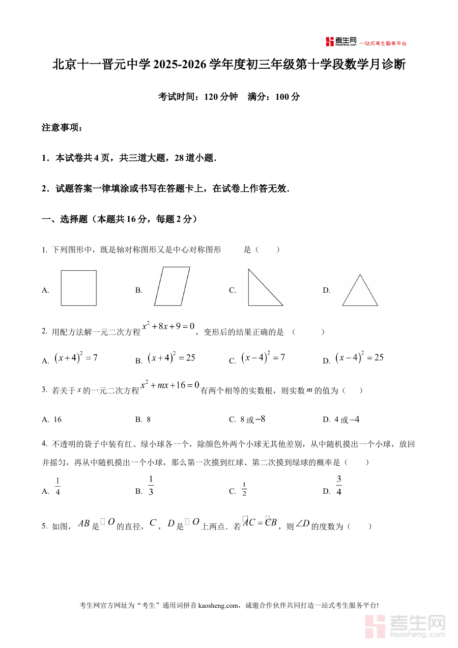 《精品解析:北京十一晋元中学2025-2026学年上学期九年级第十学段数学月诊断试题(原卷版)》是针对北京十一晋元中学2025-2026学年上学期九年级第十学段数学学科月度诊断考试的配套备考资料,聚焦该阶段数学学科的阶段性学习成果检测需求,为师生提供与校内考试直接相关的原卷形式资料支撑。