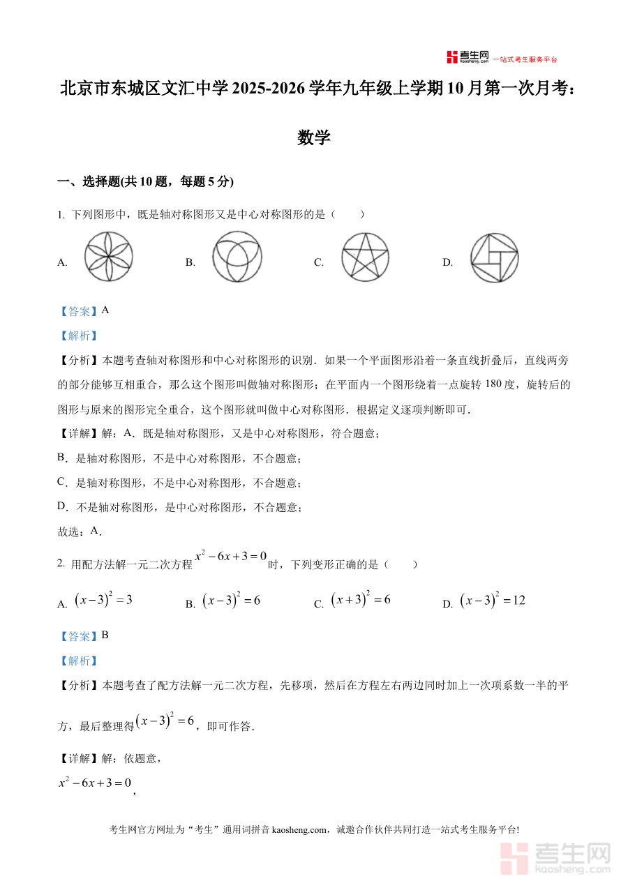 《精品解析:北京市东城区文汇中学2025-2026学年九年级上学期10月月考数学试题(解析版)》是针对北京市东城区文汇中学该学年九年级上学期10月数学月考的专业备考资料。该资料紧密贴合学校所在区域的教学进度与考试要求,聚焦九年级上学期初期数学学习的阶段性考查需求,为使用者提供与本次月考直接相关的详细解析内容,助力其精准把握考试的核心方向与考查重点。