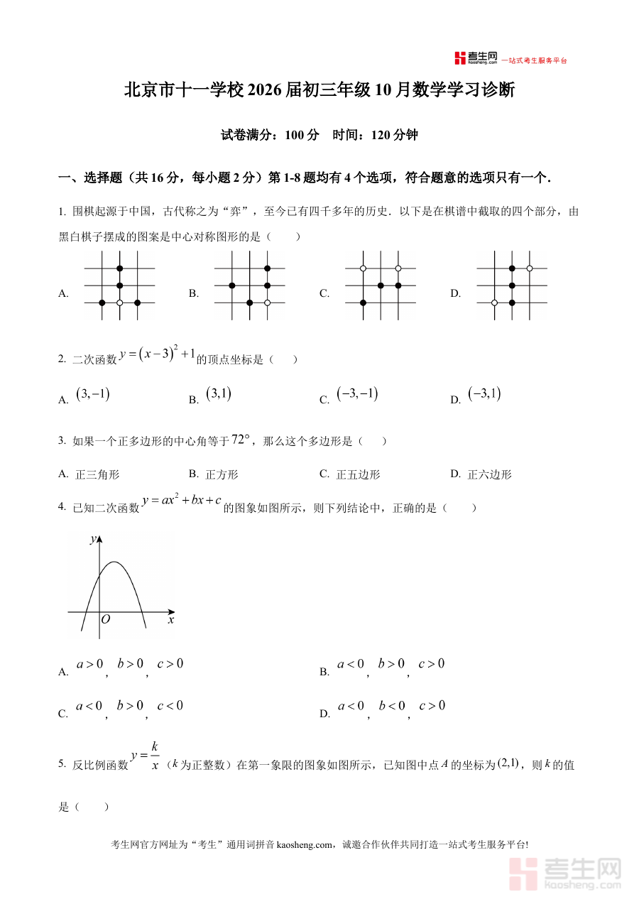 《精品解析:北京市十一学校2025~2026学年上学期10月月考九年级数学试卷(原卷版)》是针对北京市十一学校2025至2026学年上学期九年级数学学科10月月考设计的原卷版本资料,精准对应该校该阶段的数学考试需求,能够直接反映该校九年级数学在10月阶段的考查方向与试卷结构,为相关备考活动提供贴合实际的参考依据,是该阶段数学学习与备考过程中具有针对性的资料之一。