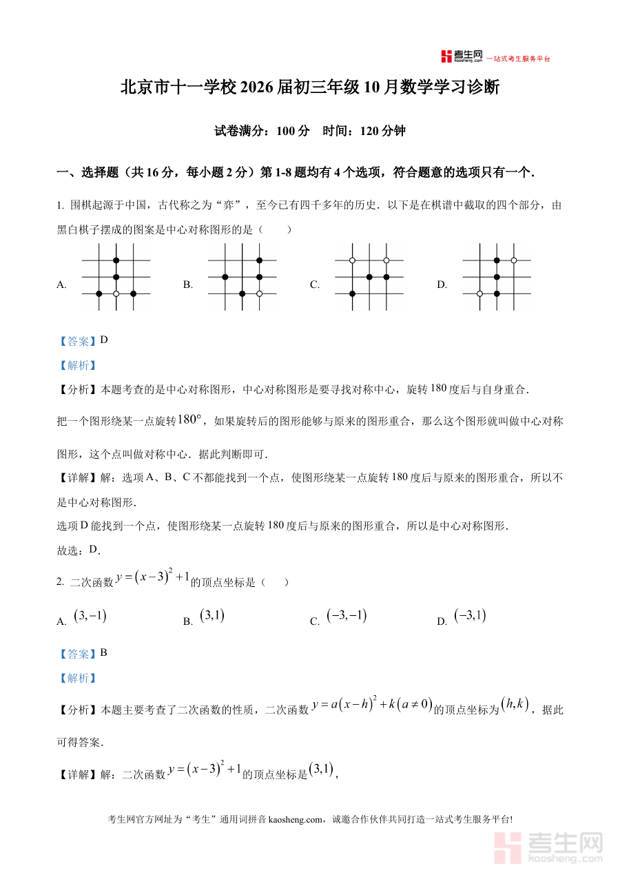 《精品解析:北京市十一学校2025~2026学年上学期10月月考九年级数学试卷(解析版)》是北京市十一学校2025至2026学年上学期针对九年级学生组织的10月数学月考配套解析资料。该资料依托学校当月的教学进度与月考测试安排,为学生提供了与实际考试场景高度匹配的专业解析支持,是阶段备考的重要参考材料。