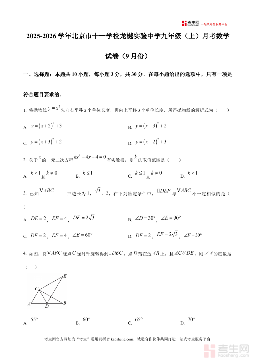 《精品解析:北京市十一学校龙樾实验中学2025-2026学年九年级上学期月考数学试卷(9月份)(原卷版)》是针对北京市十一学校龙樾实验中学2025-2026学年九年级上学期9月份数学月考的专属备考资料,紧密贴合该校该阶段的数学教学进度与考试要求,为学生提供与校考实际高度匹配的练习资源。