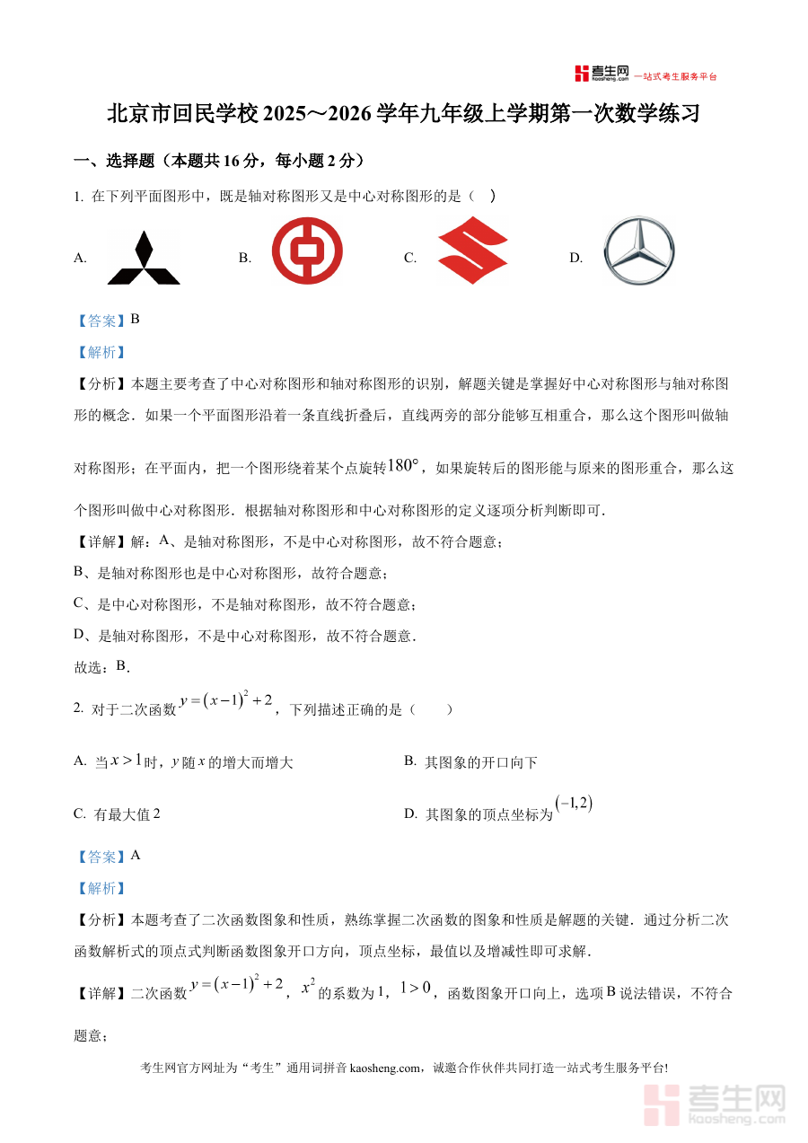 《精品解析:北京市回民学校2025~2026学年上学期九年级第一次月考数学试卷(解析版)》是针对北京市回民学校特定学年学期、特定年级与考试阶段的数学学科备考资料。它聚焦于九年级上学期第一次月考这一关键节点,整合了试卷内容与详细解析,为使用者提供与该考试直接相关的参考依据,有助于精准把握该阶段数学考试的考查方向与核心要求,是贴合该校九年级学生数学学习进度的针对性备考资源。