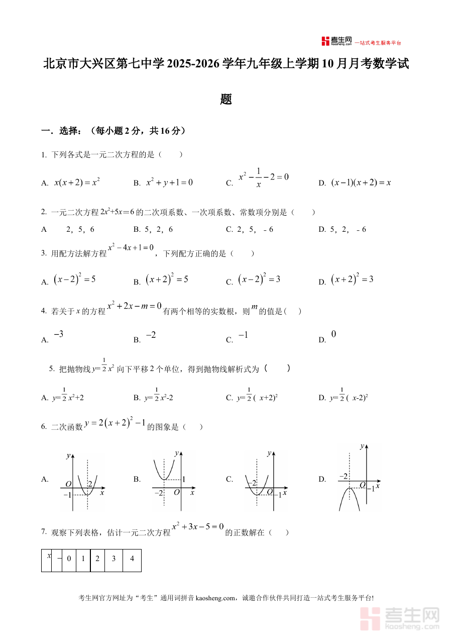 《精品解析:北京市大兴区第七中学2025-2026学年九年级上学期10月月考数学试题(原卷版)》是针对北京市大兴区第七中学2025-2026学年九年级上学期10月数学月考设计的备考资料,聚焦该阶段数学学习的检测需求,提供贴合学校教学进度与考试要求的原卷内容。