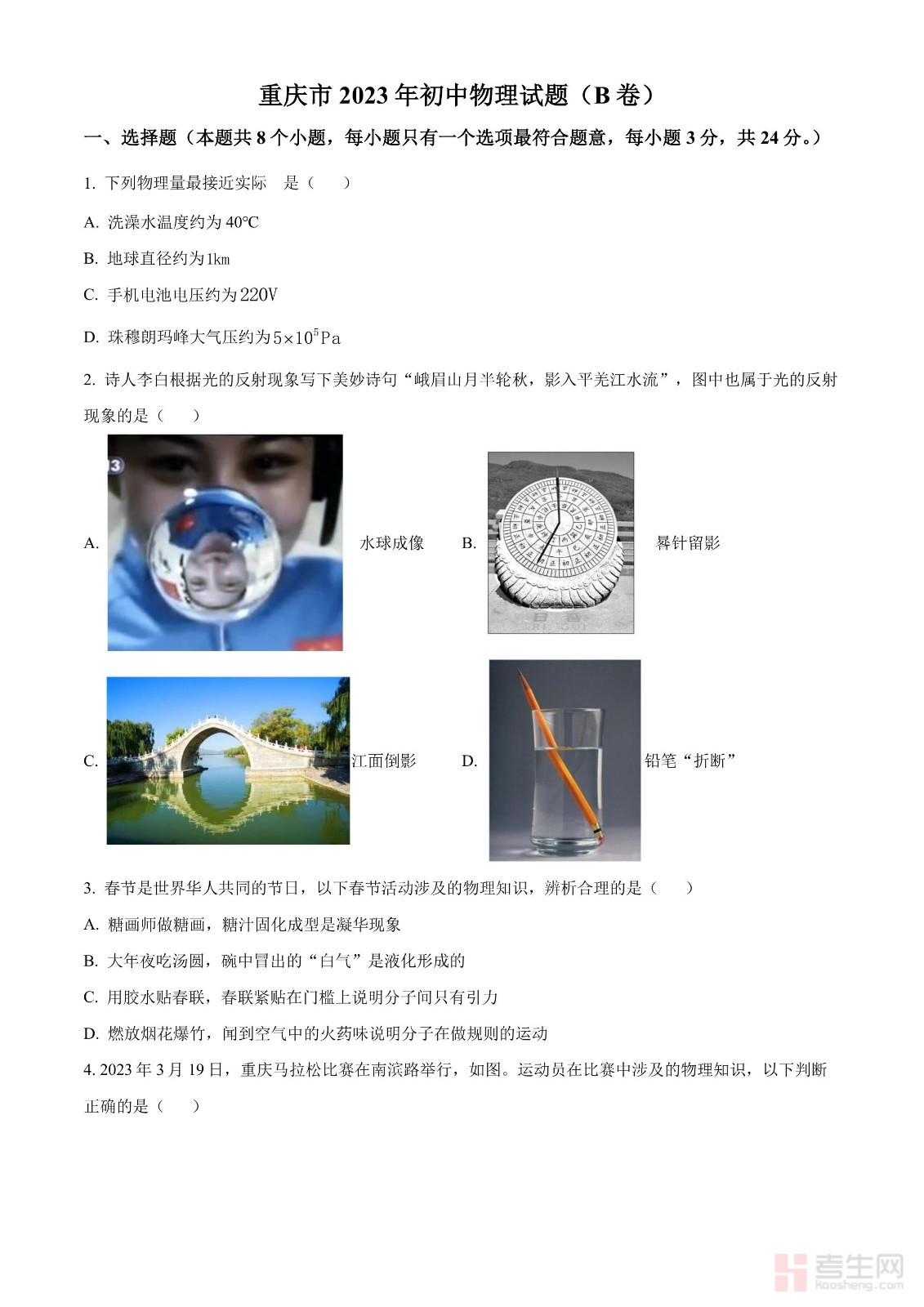 2023年重庆市中考物理试题(B卷)(原卷版)