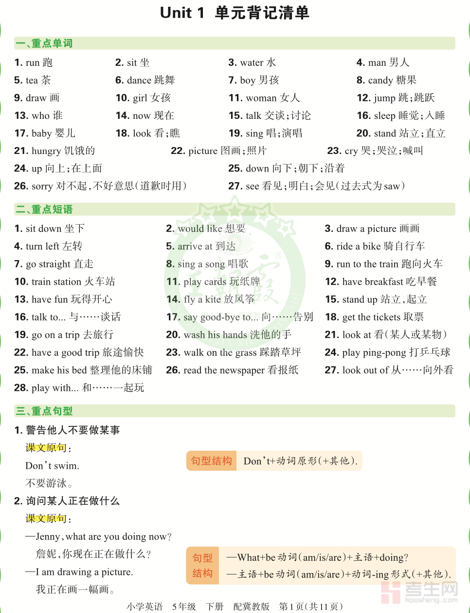 2026 年小学英语单元背记清单(冀教版)(五年级下)同步冀教版五年级下册英语教材单元编排,紧扣课堂教学与单元测试考点,是学生高效背诵、巩固基础的实用备考资料。内容按单元梳理核心单词、重点短语、经典句型、交际用语和基础语法点,标注高频考点与易错内容,条理清晰、重点突出,方便学生快速记忆、查漏补缺。侧重单词默写、句式运用、课文重点句背诵,兼顾日常同步复习与考前突击,适合课堂巩固、课后背诵、单元小测及期中期末备考使用,帮助学生扎实掌握单元知识,提升英语应试能力与学习效率。请添加微信 18617049513 进专属群,获取更多免费资源!