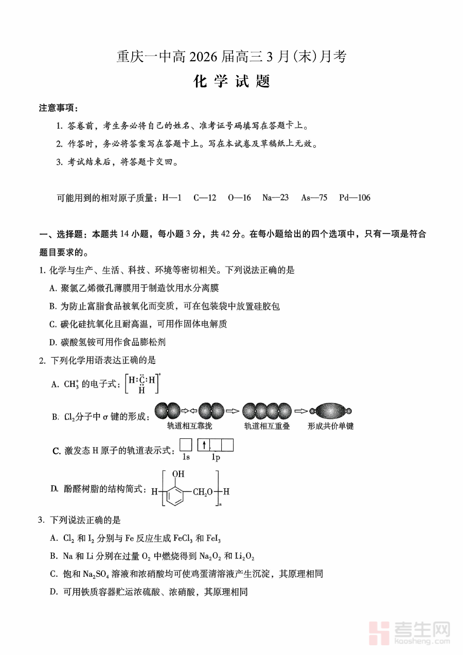 《重庆一中高2026届高三3月(末)月考 化学》是重庆地区重点中学重庆一中针对高2026届高三学生在3月末组织的阶段性月考化学学科资料,属于高三年级春季学期中期的重要检测类备考资源,能够反映该阶段学生化学学科的学习进展情况,为后续备考提供基础参考依据,帮助师生了解当前阶段的学习成效与潜在问题。
