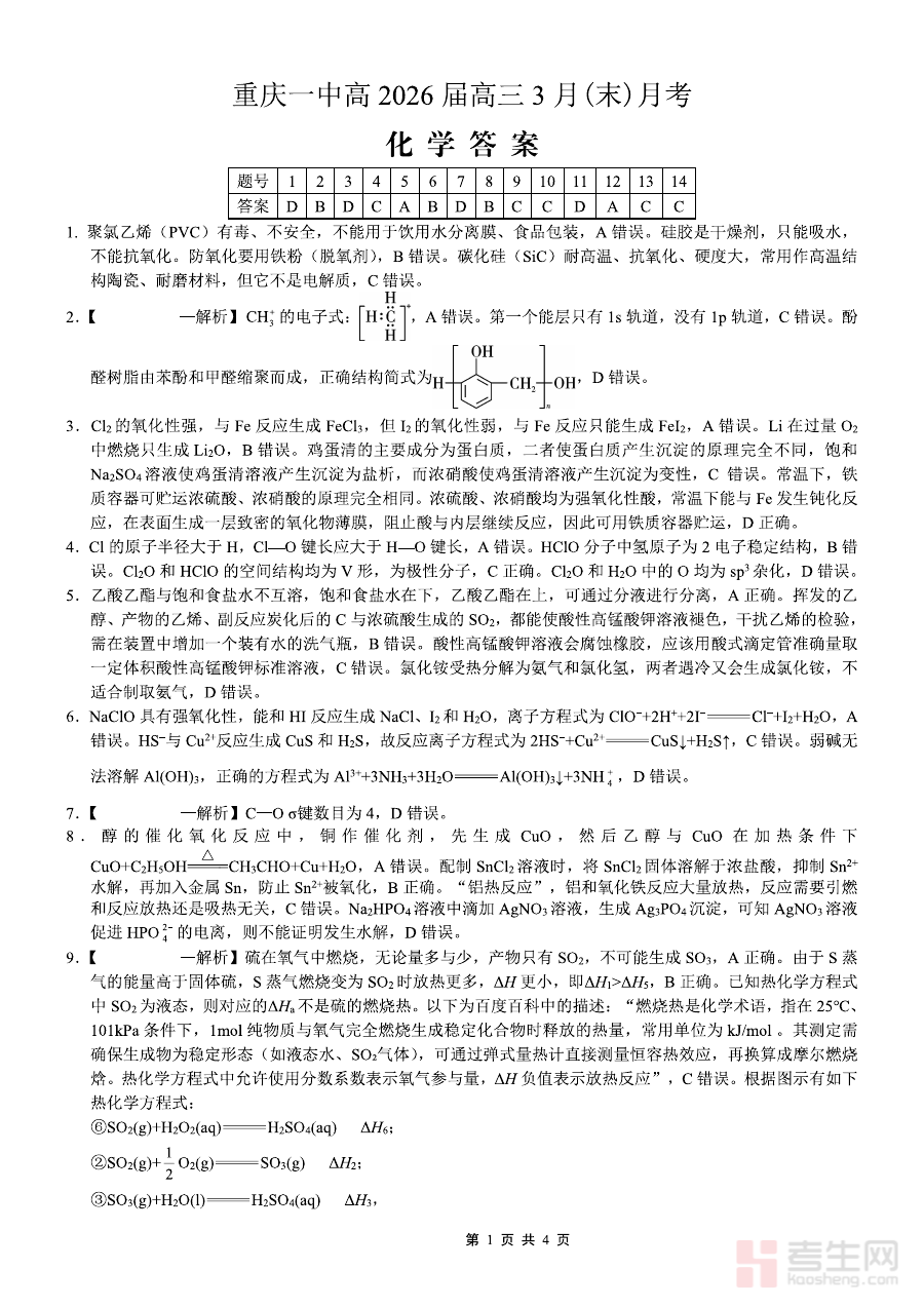 《重庆一中高2026届高三3月(末)月考 化学答案》是重庆地区重点中学重庆一中针对高2026届高三学生3月末月考推出的化学科目配套答案资料。作为与该届学生复习进度高度匹配的阶段性考试答案,它为学生提供对应考试的答题参照与结果验证依据,助力学生完成月考后的初步学习反馈。